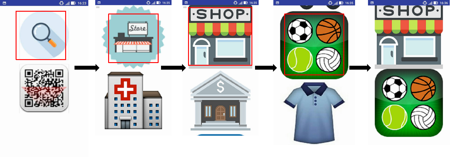 Exemple : Je suis dans un pays dont la langue m'est parfaitement inconnue. Je cherche un magasin de sport. Dans l'application, je clique sur l'icône "Recherche", puis "Centre commercial", puis "Magasin" et enfin "Sport". L'application me résume ensuite les pictogrammes choisis, je vais pouvoir les montrer à un passant pour qu'il m'indique l'emplacement de ce que je recherche.