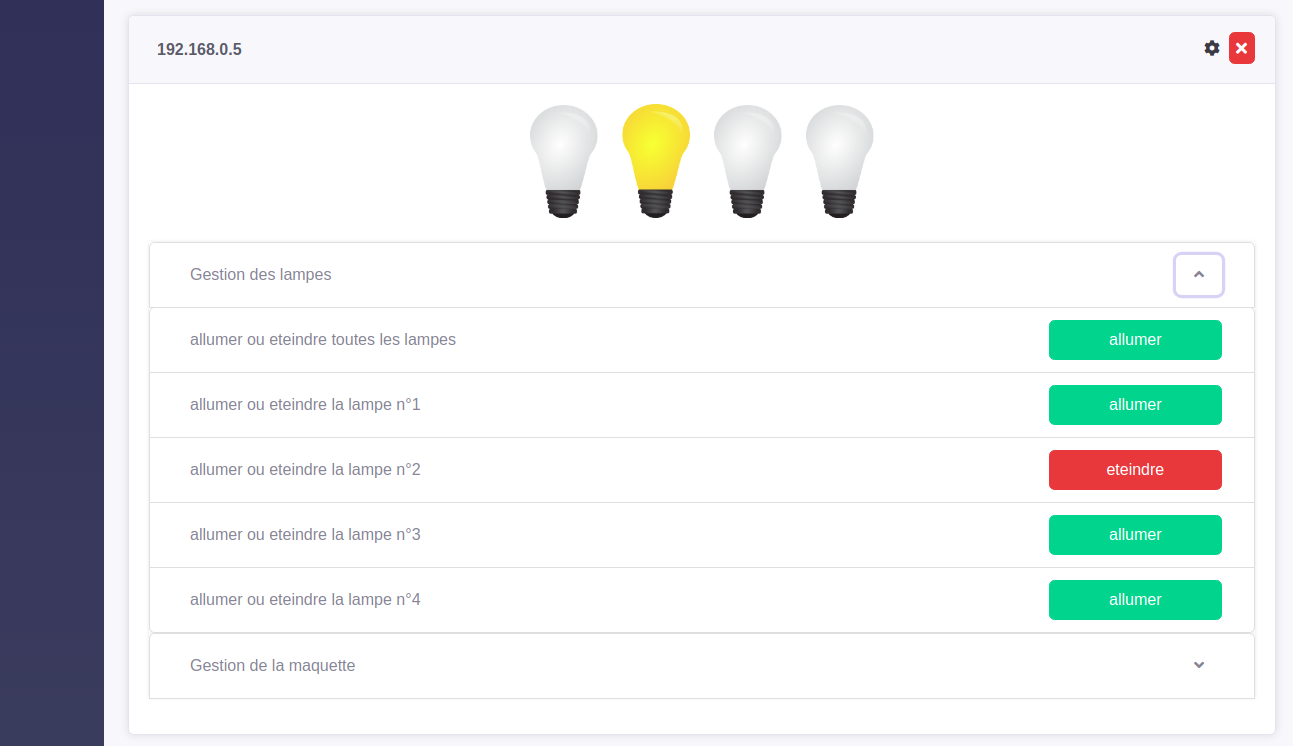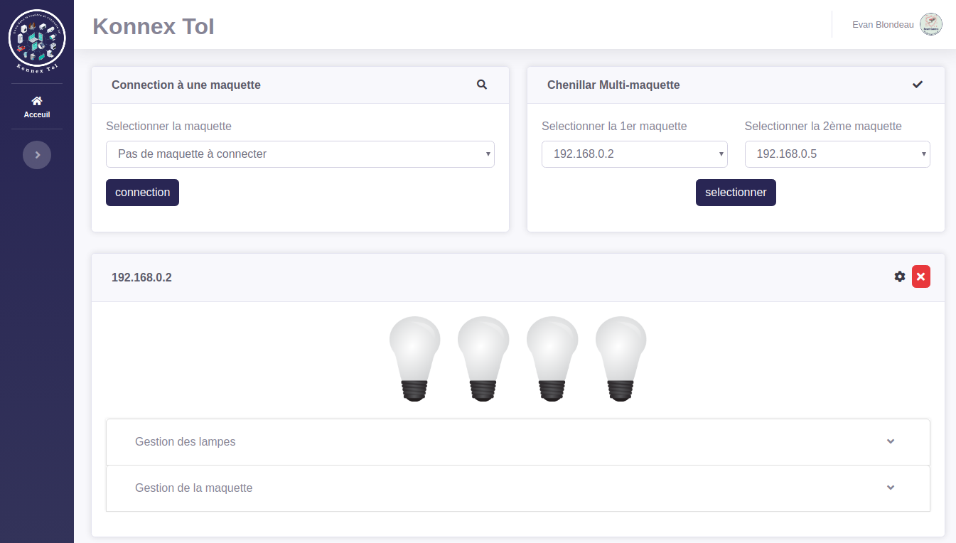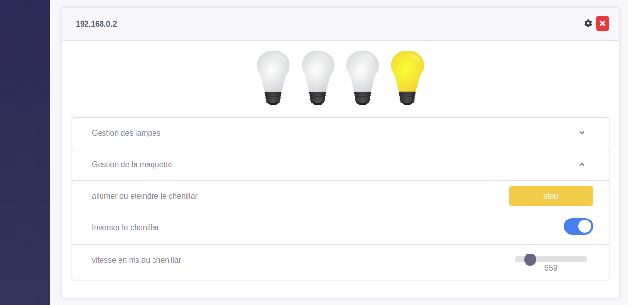 - Une application web réalisée avec Bootstrap qui a pour but de gérer les maquettes, découvrir directement les maquettes présentes sur le réseau, pouvoir synchroniser deux maquettes entre elles, avoir un retour en temps réel des actions sur les maquettes et de pouvoir interagir directement avec elles aussi.