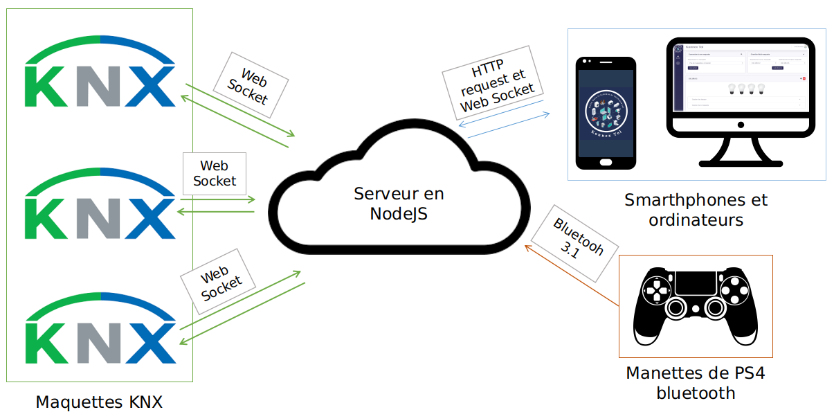 - Un serveur NodeJS pour gérer toutes les maquettes KNX ainsi que les clients web, parle une grande partie en WebSocket aux maquettes et aux clients web.