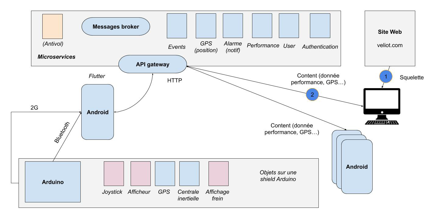 - Pour la partie applicatif, nous avons décidé de le réaliser en Flutter. Son objectif principal était de réaliser des courses et de récupérer des données, d'afficher des informations relatives aux courses effectuées et d'interagir avec les serveurs. Il y a aussi une partie de communication Bluetooth avec l'Arduino pour récupérer ces données et les envoyer aux serveurs.